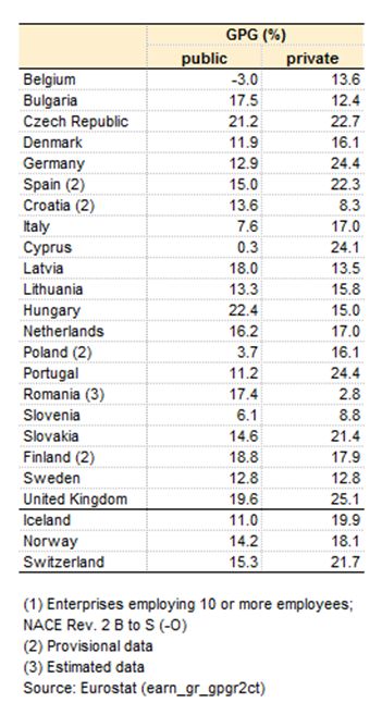 Érdekes a közszféra és a privát szektor összehasonlítása is. Magyarország ebből a szempontból a kirívó negatív példa, ahol 22%-kal keresnek többet a férfiak a közszférában mint a nők a 2013 év adatai alapján Így a a közszférában dolgozó nagy számban és arányban dolgozó női munkavállalónak különösen az egészségügy, szociális ellátás területén az alacsony jövedelmek mellett, még a jelentős béraránytalanságot is el kell viselniük. A privát szférában a magyar bérkülönbség alacsonyabb,"csak" 15%.