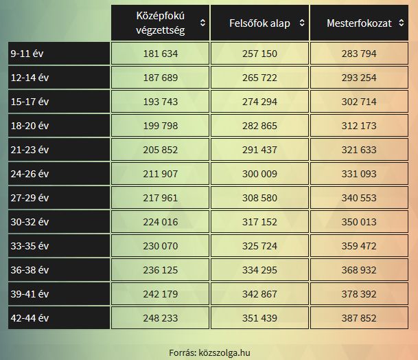 A pedagógus életpályamodell bevezetésével a magyar pedagógusok fizetése a tapasztalattal és szakképzettséggel arányosan nő. Míg eddig nettó adatok szerepeltek, most bruttó kereseti adatokat olvashatunk: