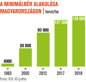 A nettó minimálbér jövőre elérheti a létminimum szintjét Magyarországon. A legkisebb havi munkabér a jelenlegi 127,5 ezer forintról 138 ezer forintra nő 2018. január elsején. Az idén 15 százalékkal emelkedett a minimálbér, jövőre pedig újabb nyolc százalékkal. Mint a Munkástanácsok Országos Szövetségének elnöke, Palkovics Imre a Világgazdaságnak elmondta: huszonöt éve nem volt példa arra, ami jövőre megvalósulhat, hogy a legkisebb havi munkabér nettó összege, amely januártól mintegy 92 ezer forint lesz, elég legyen a megélhetésre. Egyébként 1992-ben a minimálbér 8 ezer forint volt, a bruttó átlagkereset 35,8 százaléka. A Központi Statisztikai Hivatal (KSH) adatai szerint egy háztartásra vetítve, egy felnőtt létminimuma 2010-ben 78 ezer forint volt, 2014-ben már 87 ezer forint, az utóbbi a bruttó átlagkereset 42,7 százalékát tette ki.
