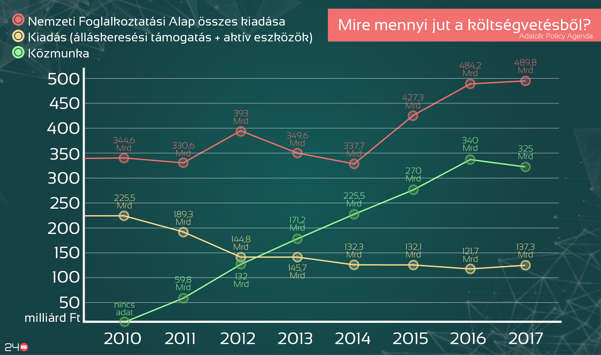 Az állam 2015-ben mindössze 50 milliárd forintot költött álláskeresési ellátásokra, és ezt 2016-ban tovább rövidítették 3 milliárd forinttal. 2017-ben is 47 milliárd forint jut álláskeresésre. Mivel a segélyezés lényegében megszűnt, ez azt jelenti a valóságban, hogy