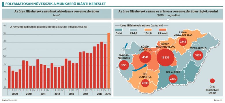 Folyamatosan bővül a hiányszakmák köre, már nemcsak informatikusból és autógyári munkásból, hanem varrónőből, valamint adminisztrátorból is hiány van – derül ki a Központi Statisztikai Hivatal első negyedéves, betöltetlen álláshelyekről kiadott jelentéséből. Míg két évvel ezelőtt, 2014 első negyedévében a versenyszektorban 23,3 ezer álláshely volt betöltetlen, addig 2016-ra ez a szám jelentősen, 36 ezer főre emelkedett. A kimutatás alátámasztja az érdekképviseletek egyre nagyobb aggodalmát a szakemberhiánnyal kapcsolatban, azonban a lapunk által megkérdezett elemző szerint van még mozgástér a hazai munkaerőpiacon – írja a Magyar Idők.