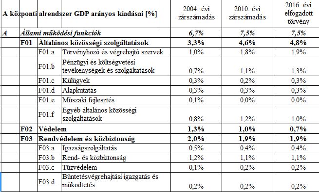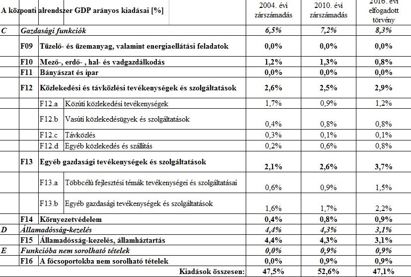 Eközben persze jelentősen átalakult az állami kiadások szerkezete: az elmúlt 12 évben drágult az állam működése, csökkentek a jóléti kiadások és látványosan elszálltak a gazdasági kiadások. A hivatalos adatok szerint a mindenkori GDP-ben mérve gyakorlatilag megduplázódtak parlament és a kormány működésnek kiadásai. Míg 2004-ben erre a célra a GDP egy százaléka ment el, jövőre már a bruttó hazai termék 1,9 százalékát költi magára az állam. A növekedés 2010 előtt volt igazán látványos, ugyanis már a kormányváltás évében a GDP 1,8 százaléka ment az állam fenntartására. Szintén emelkedtek az állami működéshez szorosan kapcsolódó költségvetési és pénzügyi tevékenységek - erre a célra a jövőre a GDP 1,3 százaléka jut már a 2004-es 0,7 százalékkal szemben.