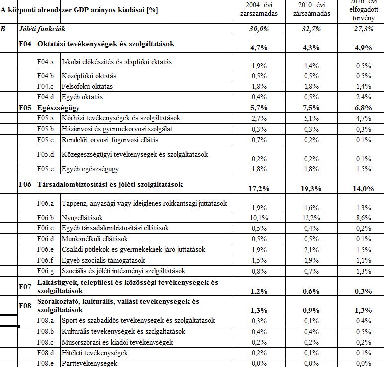 A jóléti államnak vége - igaz Magyarországon soha nem is volt elég idő arra, hogy az kialakuljon, ennek ellenére az elmúlt 12 esztendőben a jóléti, oktatási kiadások látványosan csökkentek. Az oktatási kiadások a kormány számai szerint 2004 és 2010 között csökkentek a GDP 4,7 százalékáról 4,3 százalékra, ám az utóbbi években újra emelkedtek. A felsőoktatási kiadásai csökkentek, a középfokú oktatás stagnált, míg az alapfokú oktatásra szánt kiadások látványosan visszaestek - ám ezt bővel ellensúlyozzák az egyéb oktatási kiadások növekedése - ez utóbbi trendek mögött a oktatás központosítása tükröződhet.