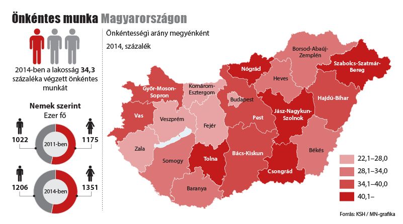 A 15–74 évesek több mint harmada, kétmillió-ötszázötvenhétezren végeztek valamiféle önkéntes tevékenységet 2014-ben, ezzel a lakosságon belüli arányuk 34,3 százalékra nőtt, ami a 2011. évihez képest 5,9 százalékpontos emelkedés. A Központi Statisztikai Hivatal (KSH) kiadványa szerint a nők továbbra is nagyobb számban és arányban kapcsolódtak be az ellenszolgáltatás nélküli tevékenységekbe, mint a férfiak: előbbiek 35, utóbbiak 33,6 százaléka segített munkájával. A férfiak gyakrabban vállalnak közéleti szerepet, aktívabbak a társadalmi szervezetekben, az önkéntes kuratóriumi munkákban. A nők ezzel szemben a közvetlen segítséget – a gyermekfelügyeletet, a betegápolást, az idősgondozást – vállalják nagyobb arányban.
