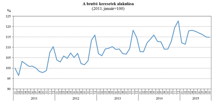 2015. január–szeptemberben a teljes munkaidőben alkalmazásban állók nemzetgazdasági szintű átlagos bruttó keresete – a legalább öt főt foglalkoztató vállalkozásoknál, a költségvetési intézményeknél és a megfigyelt nonprofit szervezeteknél – 243 ezer forint volt.