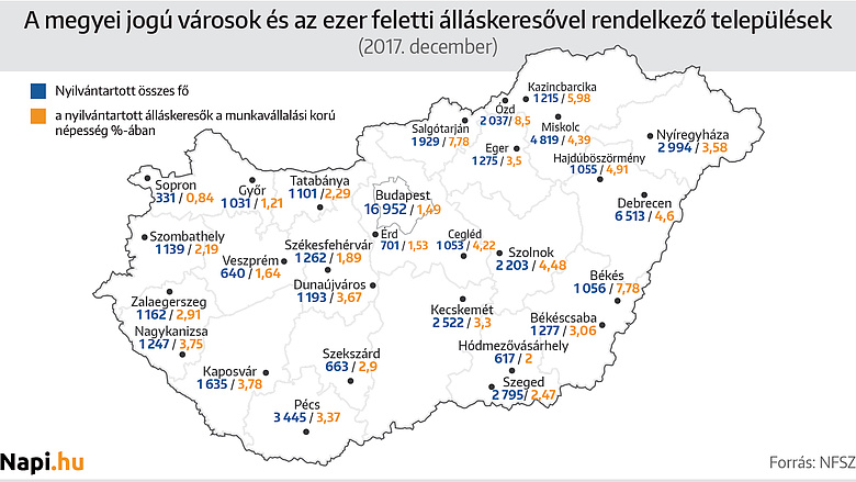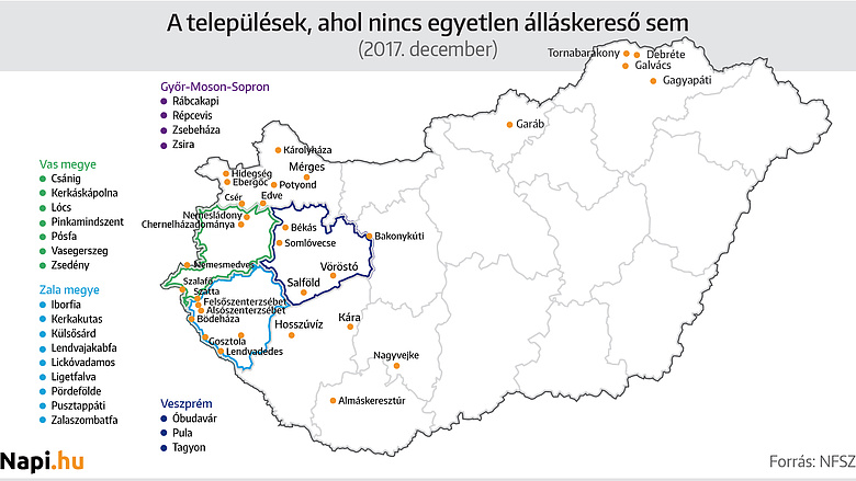 Az országban az év végén 55 olyan település volt, ahol egyetlen egy álláskeresőt sem talált a hatóság. Emellett pedig 37 olyan, ahol a lakosság ötöde munkanélküli. A Napi.hu körképe a legjobban és legrosszabbul teljesítő településekről.