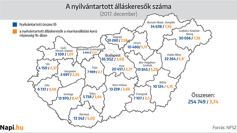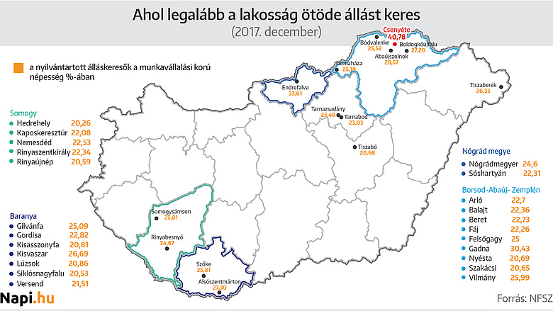 A friss, 2017 december 22-én publikált adatok ehhez képest felemás képet mutatnak: egyrészt 55 olyan település volt, ahol nem volt regisztrált munkanélküli, másrészt 37 olyan, ahol 20 százalék felett volt az álláskeresők száma a munkavállalási korú népességhez viszonyítva. Azaz hiába nőtt a munkanélküli-mentes települések száma, közben nőtt azoké is, ahol szinte reménytelen a helyzet.