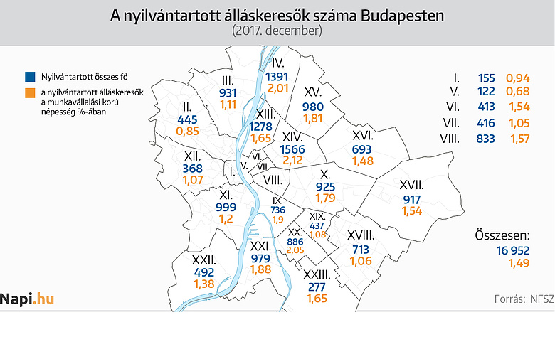 A fővárosban nagy különbségeket nem lehet felfedezni, a legjobb helyzetben az V. kerület van, ahol a munkakorúaknak mindössze a 0,68 százaléka nem talált állást, míg a másik végletet Zugló jelenti, 2,12 százalékkal.